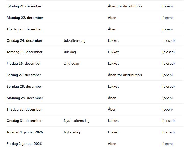 For at vi sammen kan sikre en smidig planlægning og levering, anbefaler vi, at bestillinger til perioden lægges i god tid. Tak for det gode samarbejde – vi ser frem til at hjælpe jer.